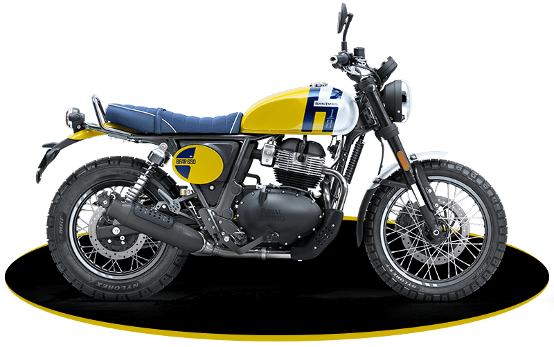 A road scrambler with a sixties soul. Inspired by the Big Bear Run in the Californian desert. Fueled by gut feel, powered by the acclaimed Royal Enfield parallel twin.