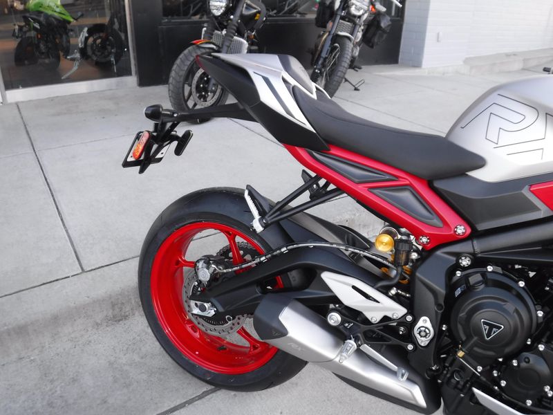 • Street Triple attitude: A striking RX livery with a clean Matte Aluminum base with striking Diablo Red accents and bold RX branding. A scheme that pays homage to the original Street Triple 765 RX.
